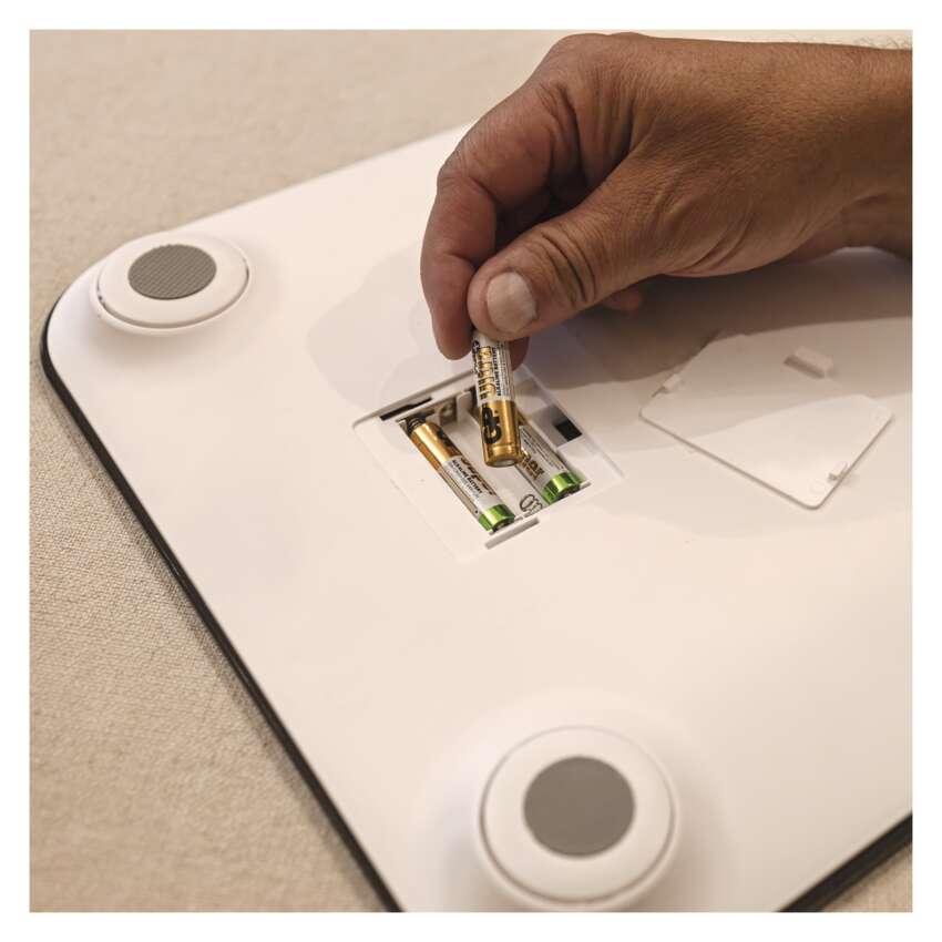 Mit unserer intelligenten Waage können Sie sofort nach dem Auspacken Ihr Gewicht messen und Ihre Fitness verfolgen. Drei 1,5V AAA-Batterien sind im Lieferumfang enthalten, die Sie einfach in die Waage einlegen und sie ist sofort bereit, sich mit der mobilen App zu verbinden.