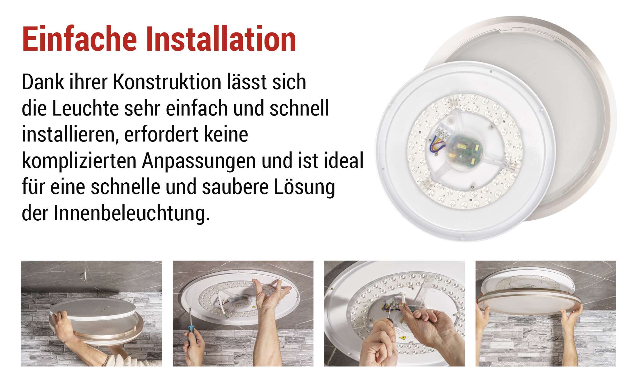 Mit Standardbefestigungen lässt sich die Leuchte für eine moderne, gleichmäßige und stilvolle Innenbeleuchtung einfach anbringen. Diese Lösung spart Zeit und Energie und ist sowohl für neue als auch für renovierte Räume ideal.