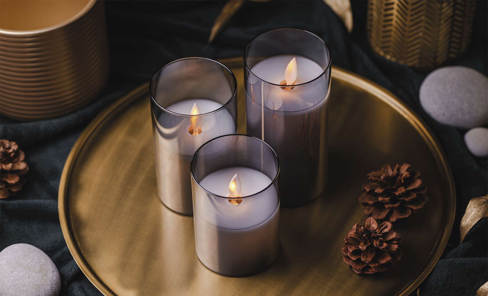 Set aus 3 Glas-LED-Kerzen mit beweglicher Flamme