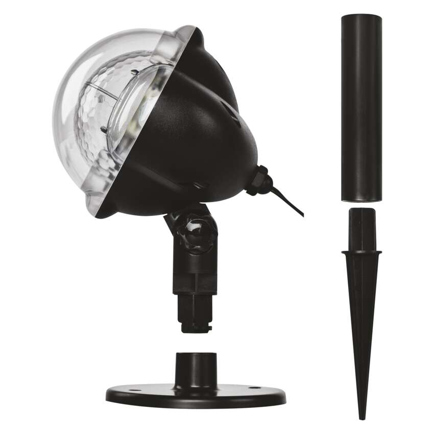 Das Aufstellen des Projektors im Garten oder in Innenräumen ist dank des langen 3 m langen Netzkabels ein Kinderspiel. Ein praktischer Ständer zum Aufstellen des Projektors auf einer harten Oberfläche ist ebenfalls enthalten. Eine weitere Installationsmöglichkeit ist die Verwendung des mitgelieferten Erdspießes, der einfach in den Rasen oder Pflanzkübel gesteckt werden kann.