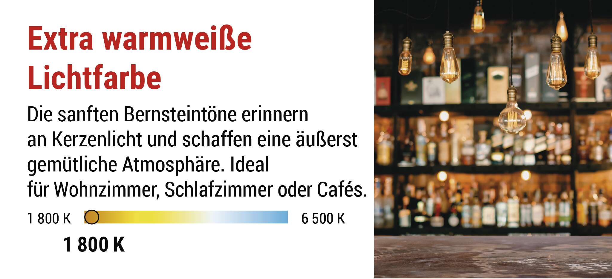 Entdecken Sie die Magie des warmen Lichts mit unseren stilvollen LED-Lampen, die moderne Energieeinsparung mit klassischem Design kombinieren. Mit einer Farbtemperatur von 1.800K schaffen sie eine warme und gemütliche Atmosphäre, ideal für Ihr Zuhause und Ihre Geschäftsräume.