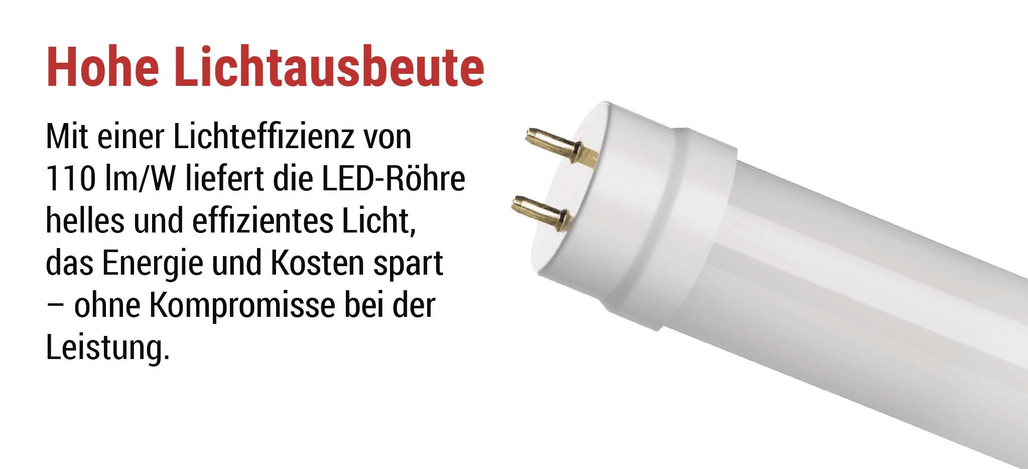 Durch ihre hohe Lichtausbeute bieten LED-Leuchtstofflampen einen intensiven Lichtstrom bei geringem Energieverbrauch. So erzielen Sie eine helle und gleichmäßige Ausleuchtung und sparen gleichzeitig deutlich an Betriebskosten. Die hohe Effizienz sorgt dafür, dass jede verbrauchte Wattstunde in maximales Licht umgewandelt wird.
