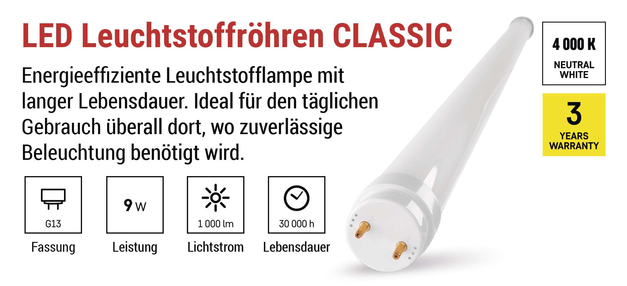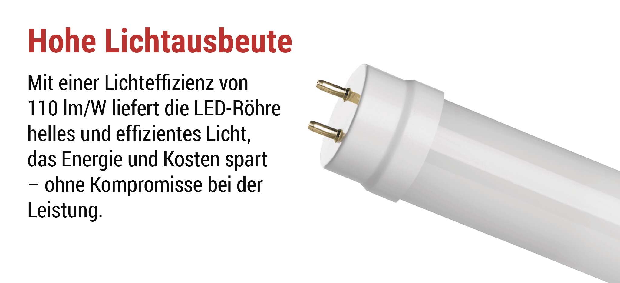 >Dank ihrer hohen Lichtausbeute bieten LED-Leuchtstofflampen einen intensiven Lichtstrom bei geringem Energieverbrauch. So erzielen Sie eine helle und gleichmäßige Ausleuchtung und sparen gleichzeitig deutlich an Betriebskosten. Die hohe Effizienz sorgt dafür, dass jede verbrauchte Wattstunde in maximales Licht umgesetzt wird.