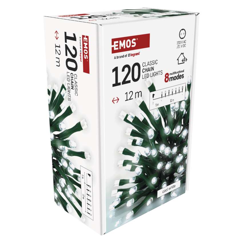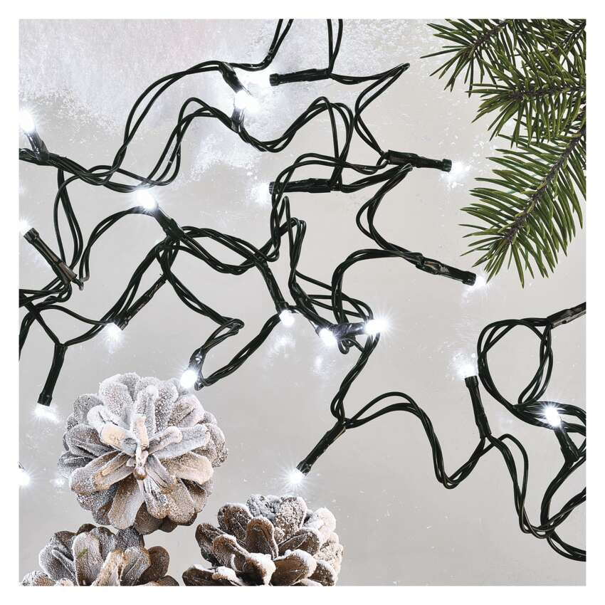 Erleuchten Sie Ihr Zuhause mit einem Licht, das Frieden, Harmonie und den wahren Zauber von Weihnachten bringt. Diese LED-Weihnachtskette in 12 Metern mit der Lichtfarbe Kaltweiß erzeugt einen eleganten und klaren Effekt, der sowohl moderne als auch klassische Weihnachtsdekorationen perfekt ergänzt. Dank des grünen Kabels fügt sie sich auf natürliche Weise in die Zweige von Bäumen und in die Außendekoration ein und sorgt für einen ästhetischen Gesamteindruck.