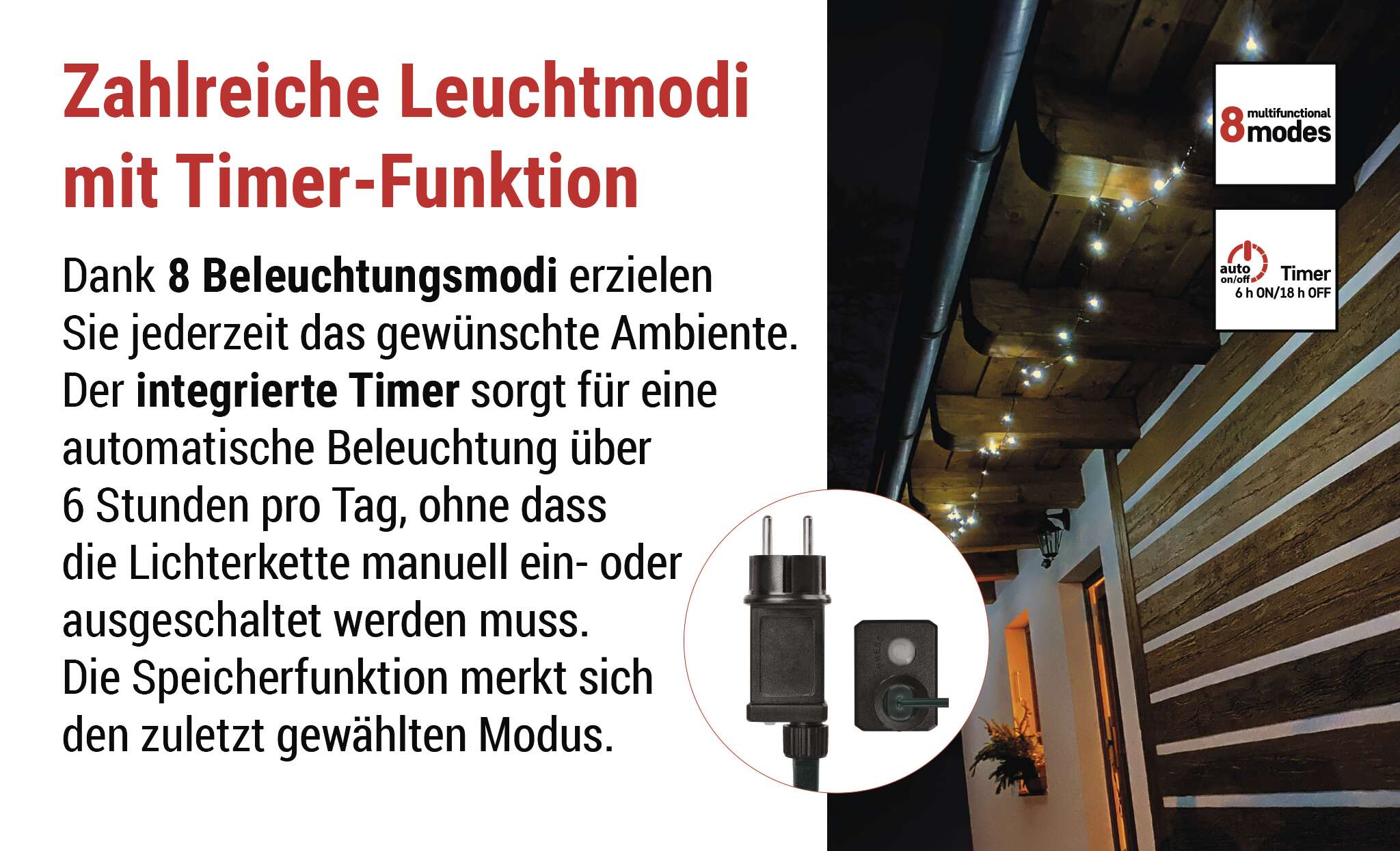 Der zuletzt gewählte Modus wird automatisch gespeichert, so dass die Kette beim erneuten Einschalten genau so leuchtet, wie Sie es zuletzt eingestellt haben.