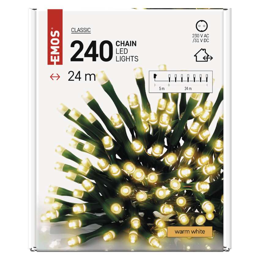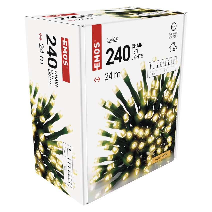 EMOS CLASSIC LED-Ketten sind in verschiedenen Formen erhältlich - klassische Ketten, Cluster und Stalaktiten. Sie sind unverzichtbar, um die richtige festliche Atmosphäre zu schaffen. Sie sehen toll aus an einem traditionellen Weihnachtsbaum, sie eignen sich zum Schmücken von Möbeln, Geländern, Balken oder Türen im Innenbereich.Sie können sie auch im Freien verwenden, um Ihre Sträucher, Bäume, Pergolen, Pavillons usw. zu beleuchten.