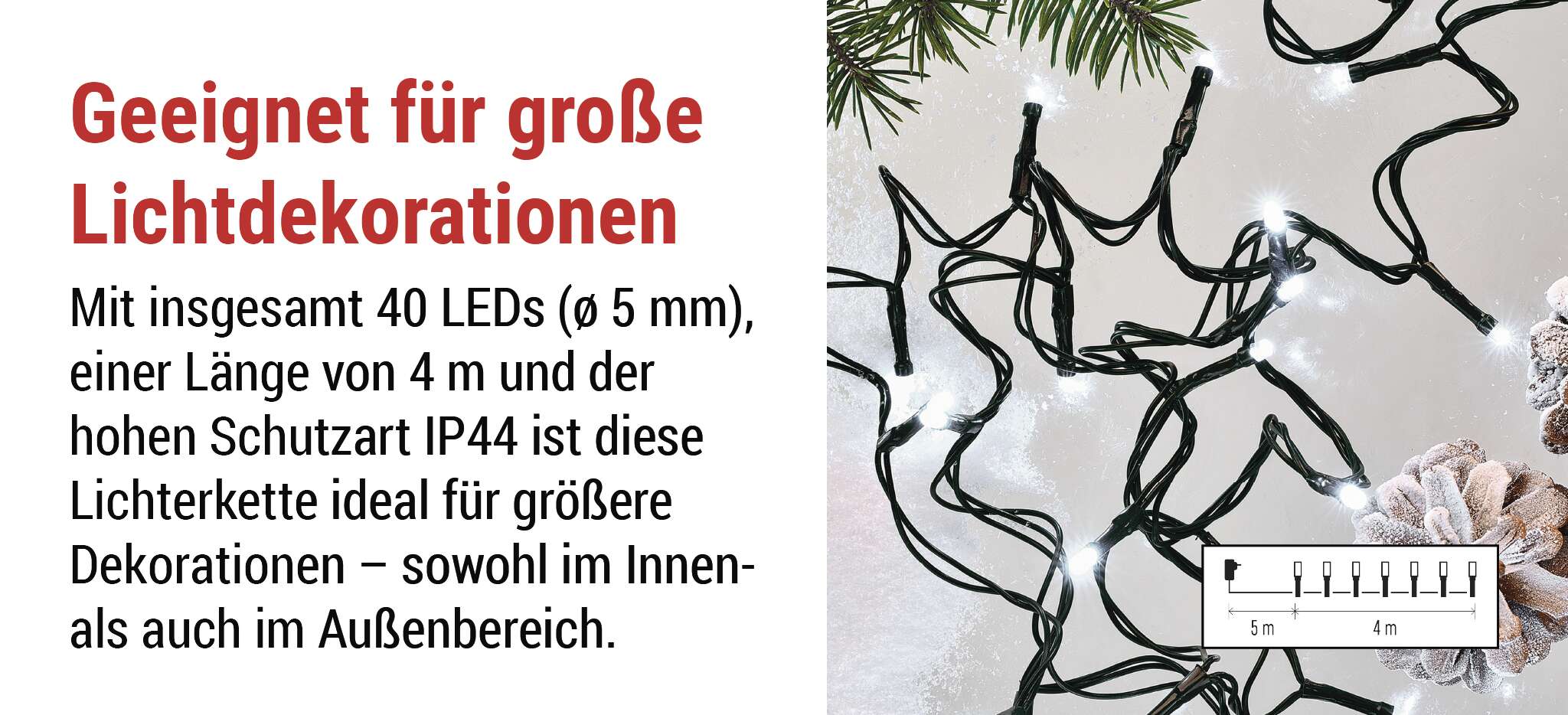 LED Weihnachtliche Lichterkette, 4 m, Außen/Innen, kaltweiß, Programme, Timer
