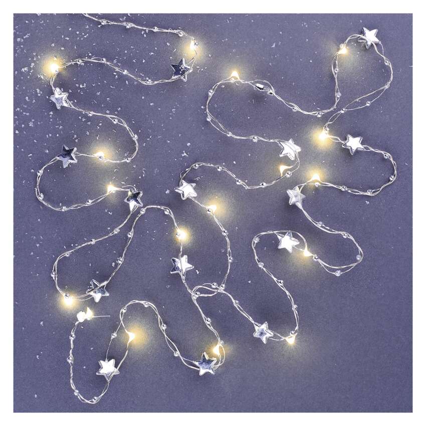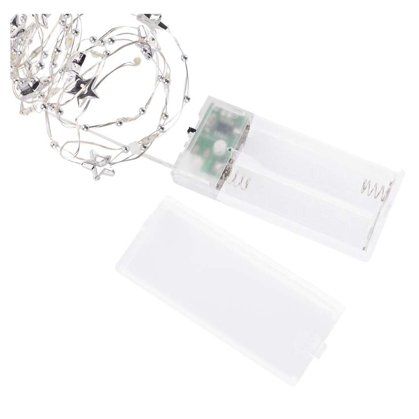 LED Weihnachtslichterkette silberfarben – Sternchen, 1,9 m 2x AA, Innen, warmweiss, Timer