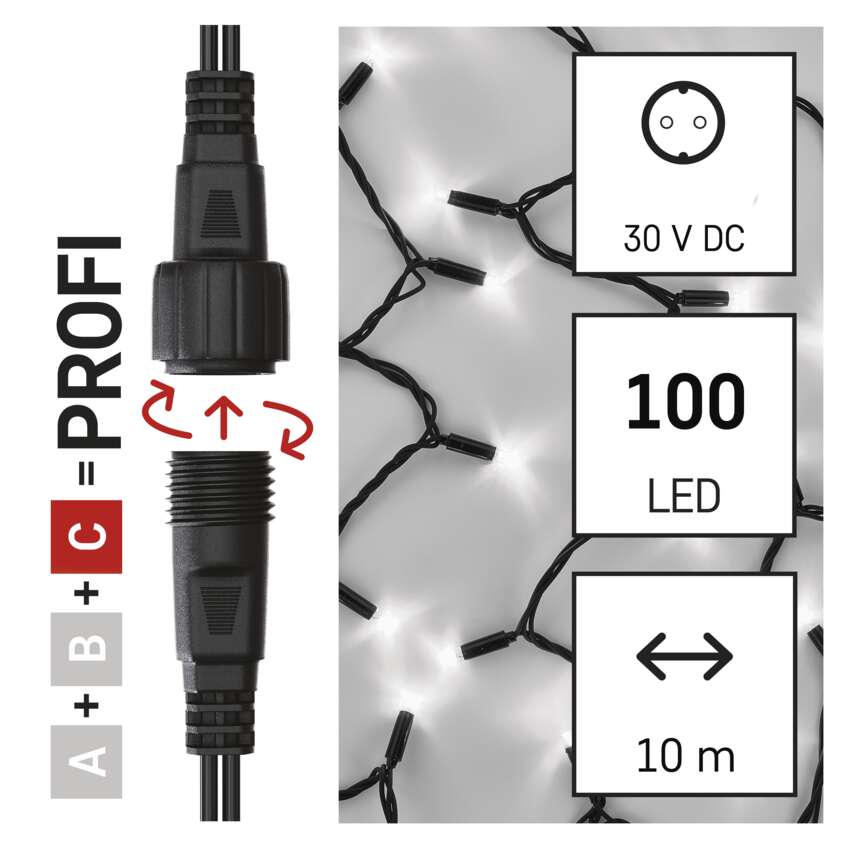 Das Anschlusssystem CONNECT SYSTEM PROFI ist dank der Schutzart IP44 für den Innen- und Außenbereich geeignet. Sie zeichnet sich durch erhöhte Materialbeständigkeit und erweiterte Garantie von 3 Jahren aus. Hochwertige Gummikabel ermöglichen eine ganzjährige Installation ohne Demontage bei allen Temperaturbedingungen. Wählen Sie zwischen Standardketten, Steppern und Clustern. Von einer einzelnen Stromversorgung (A), die an Verlängerungskabel, Splitter (B) und LED-Leuchtelemente(C) können bis zu 500 LED-Leuchten betreiben.