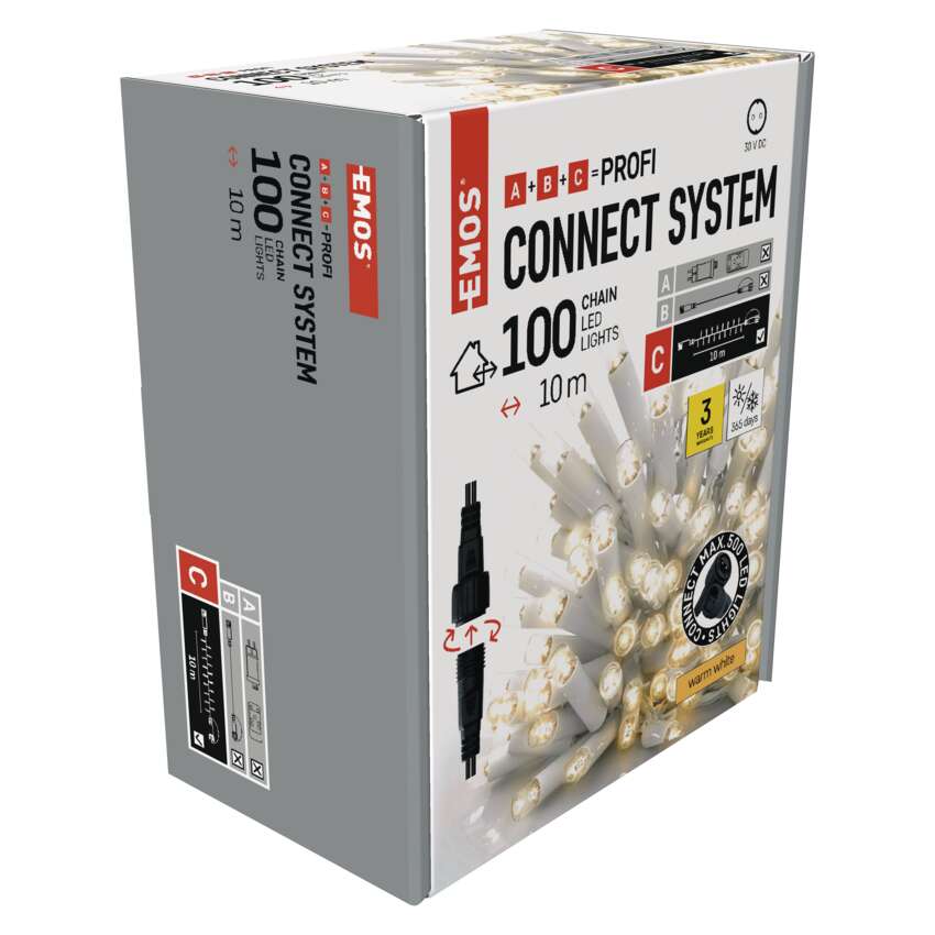 Das Anschlusssystem CONNECT SYSTEM PROFI ist dank der Schutzart IP44 für den Innen- und Außenbereich geeignet. Sie zeichnet sich durch erhöhte Materialbeständigkeit und erweiterte Garantie von 3 Jahren aus. Hochwertige Gummikabel ermöglichen eine ganzjährige Installation ohne Demontage bei allen Temperaturbedingungen. Wählen Sie zwischen Standardketten, Steppern und Clustern. Von einer einzelnen Stromversorgung (A), die an Verlängerungskabel, Splitter (B) und LED-Leuchtelemente(C) können bis zu 500 LED-Leuchten betreiben.