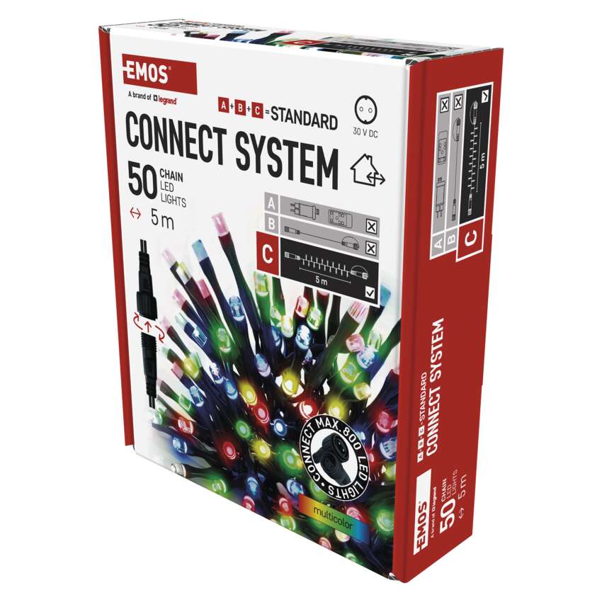 Das Anschlusssystem CONNECT SYSTEM STANDARD ist sowohl für den Innen- als auch für den Außenbereich geeignet auf Grund der Schutzart IP44, jedoch nur saisonal, nicht ganzjährig. Der Vorteil dieses Anschlusssystems ist die große Auswahl an LED-Leuchtelementen (C) in mehreren Farben. Obwohl die beliebteste Weihnachtsbeleuchtung die Kette ist, können Sie beim Verbindungssystem zwischen Stalaktiten, Vorhängen, Netzen oder Sternen für die Spitze des Weihnachtsbaums wählen, ganz nach Ihren eigenen Gestaltungswünschen. Von einer einzigen Stromversorgung (A), die an Verlängerungskabel, Hubs (B) und LED-Leuchtelemente(C) können bis zu 800 LED-Leuchten betreiben.