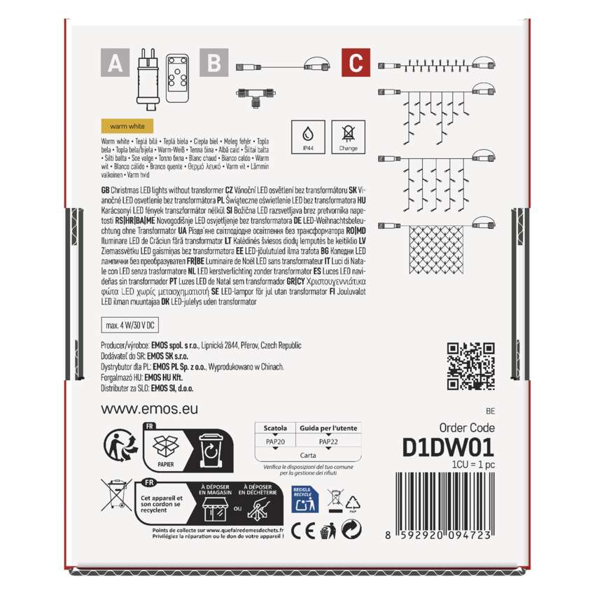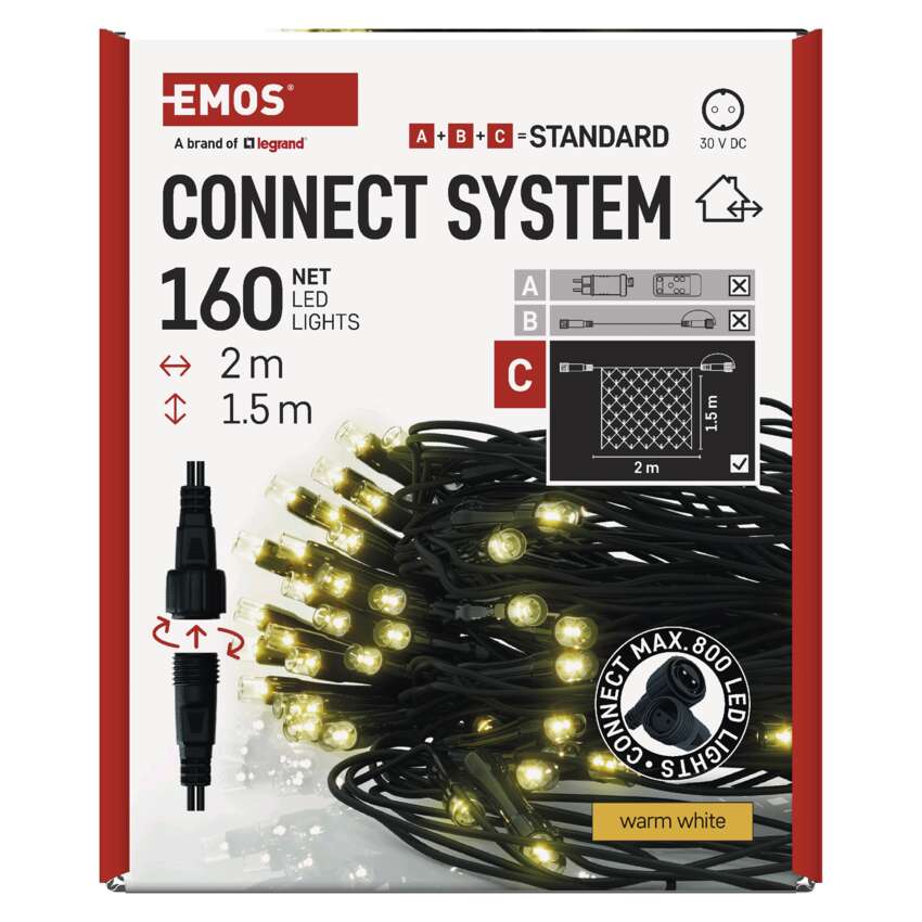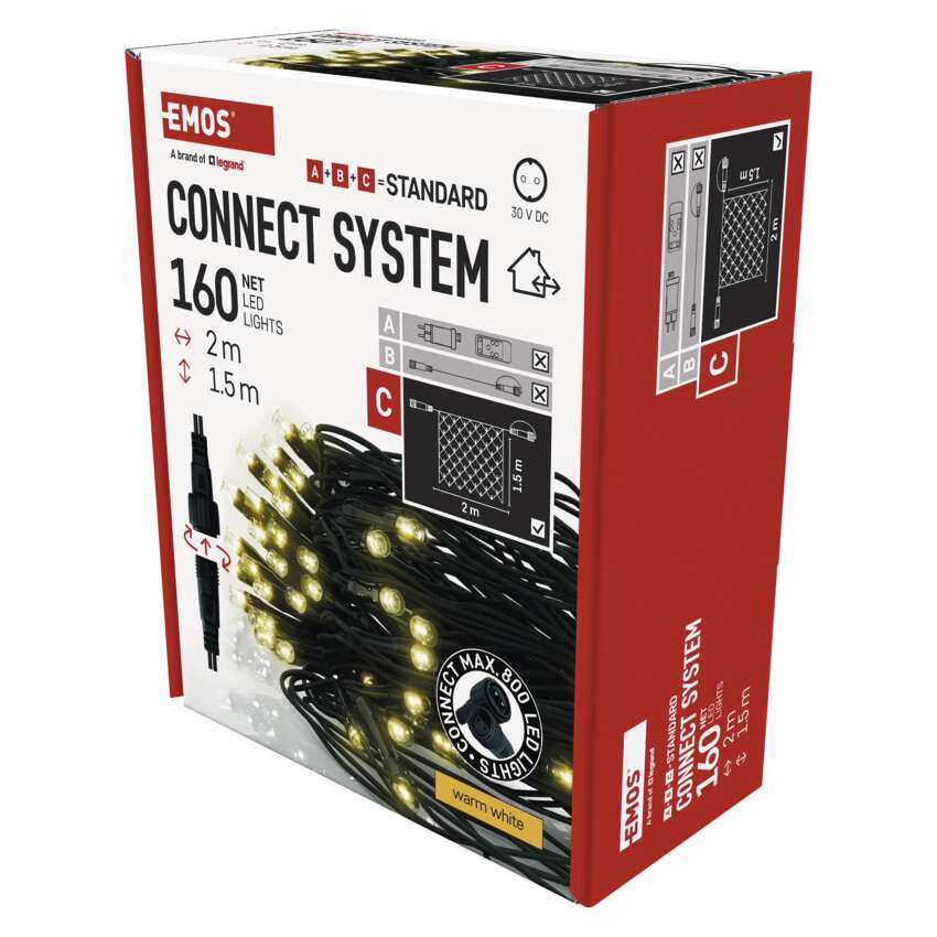 Das Anschlusssystem CONNECT SYSTEM STANDARD ist dank der Schutzart IP44 für den Innen- und Außenbereich geeignet, allerdings nur saisonal, nicht ganzjährig. Der Vorteil dieses Anschlusssystems ist die große Auswahl an LED-Leuchtelementen (C) in mehreren Farben. Obwohl die beliebteste Weihnachtsbeleuchtung die Kette ist, können Sie beim Verbindungssystem zwischen Stalaktiten, Vorhängen, Netzen oder Sternen für die Spitze des Weihnachtsbaums wählen, ganz nach Ihren eigenen Gestaltungswünschen. Von einer einzelnen Stromversorgung (A), die an Verlängerungskabel, Hubs (B) und LED-Leuchtelemente(C) können bis zu 800 LED-Leuchten betreiben.