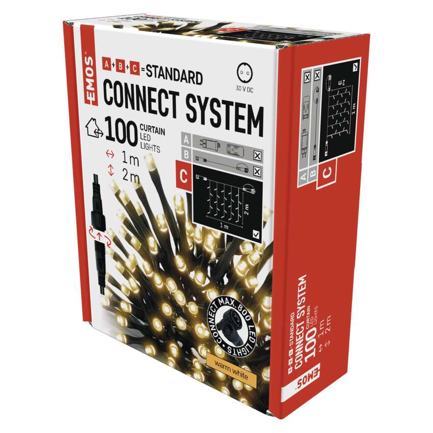Die CONNECT SYSTEM STANDARD LED-Lichtvorhänge sind in 1 × 2 m erhältlich und enthalten 100 LED-Leuchten. Wenn Sie auf der Suche nach der Farbe sind, die am besten zum Äußeren oder Inneren Ihres Hauses passt, können Sie zwischen Warmweiß und Kühlweiß wählen.