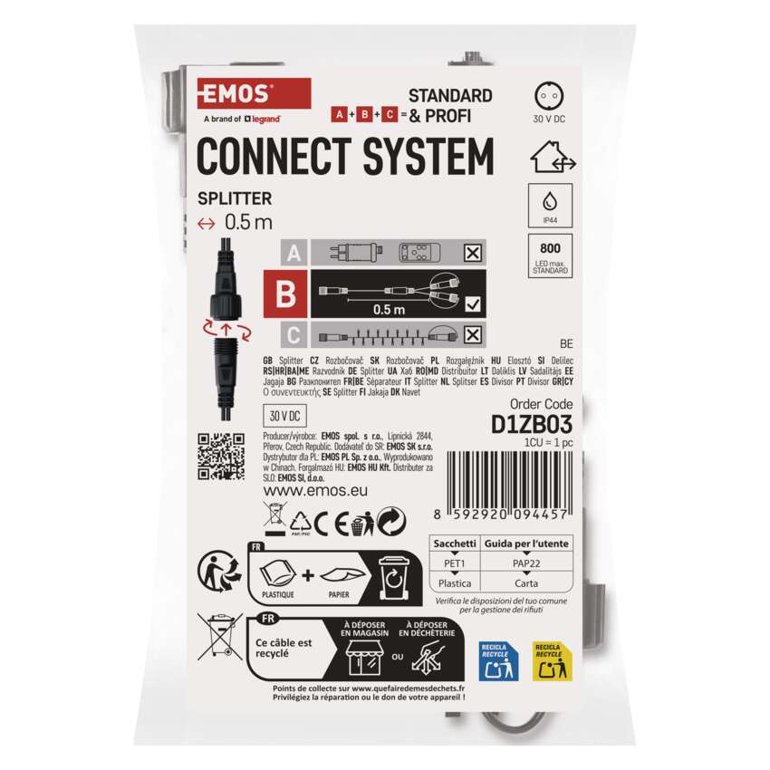 Die einzelnen LED-Leuchtelemente (C) des Verbindungssystems CONNECT SYSTEM in den Varianten STANDARD und PROFI können zusammengeschaltet werden, Kombiniert und mit Hilfe von Verlängerungskabeln und Splittern (B) verzweigen und schmücken sie auch entlegene Orte. Durch die schrittweise Erweiterung mit zusätzlichen Komponenten ist es möglich, eine professionelle und umfangreiche Beleuchtung ohne hohe Anfangsinvestitionen zu erreichen. Die zusammenhängende LED-Beleuchtung ist somit die ideale Wahl für spektakuläre Außendekorationen, bei denen herkömmliche Kettenlängen nicht ausreichen. Jeder kann das System tatsächlich installieren.