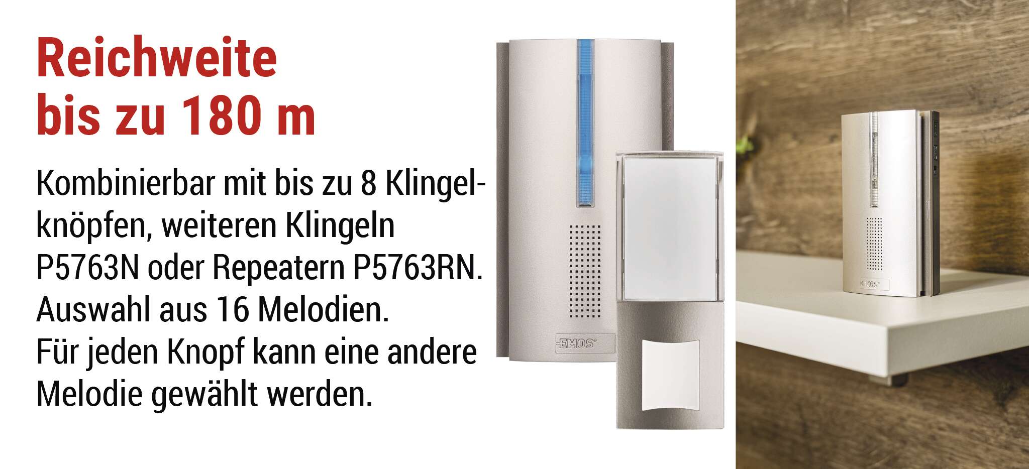 EMOS P5763RN empfängt das Signal der Klingeltaste (z.B. P5760T) und wiederholt es gleichzeitig. Sie dient somit als Repeater und erweitert effektiv die Reichweite des gesamten Klingelsystems. Er kann mit Türklingeln der Serien EMOS P5760N und P5763N kombiniert werden, um bis zu 8 verschiedene Tasten hinzuzufügen.
